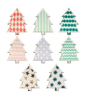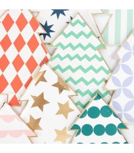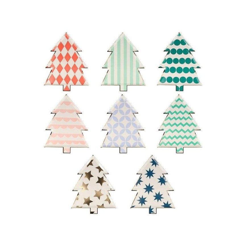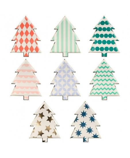 Ces assiettes en forme de sapin de Noël présentent chacune un motif et une couleur différent et ont toutes une bordure en papier alu doré brillant pour une touche élégante.