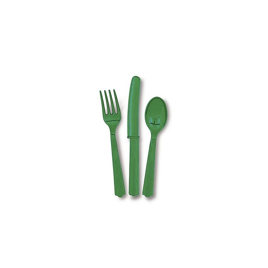 Chaque paquet comprend 18 pièces de couverts en plastique de couleur vert, soit 6 cuillères, 6 fourchettes et 6 couteaux.